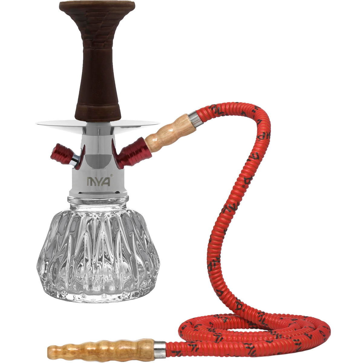 MYA's Heera 256z is the smallest from our collection of Hookahs to feature a stainless steel stem and has been paired with a modern clay phunel style burner. The Heera base is offered in clear glass, and 5 different color stem combinations.