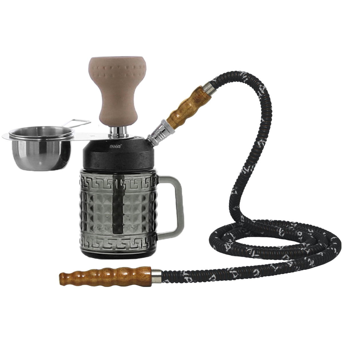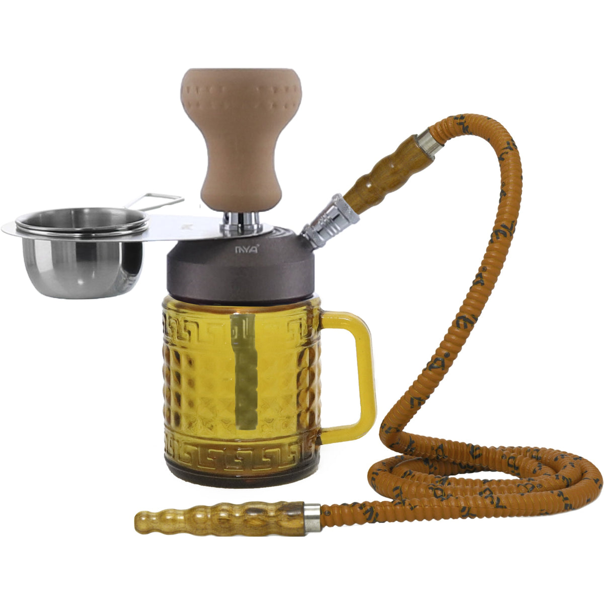The small 10.5" MYA Jarra Hookah is a mug-style Hookah with a handle that allows for perfect portability; and a Spoon Style Charcoal Holder that will completely prevent any coals from being dropped while transporting it. The Small Jarra Hookah is the perfect travel Hookah. It has a side handle that makes it easy to be carried.